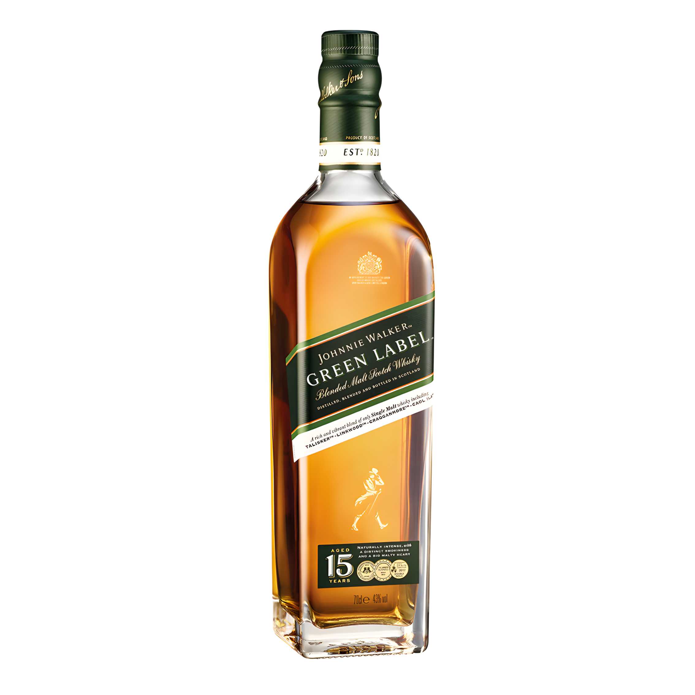 Johnnie Walker Green Label е изискан бленд, създаден изцяло от едномалцови шотландски уискита, всяко отлежавало поне 15 години. Комбинацията от Talisker, Linkwood, Cragganmore и Caol Ila носи дълбочина, комплексност и хармония. Ароматът съчетава свежи билки, опушени нотки и лек торф. Вкусът е мек и плътен, с балансирани нюанси на ванилия, дъб и малц. Подходящ както за ценители, така и за специални поводи.