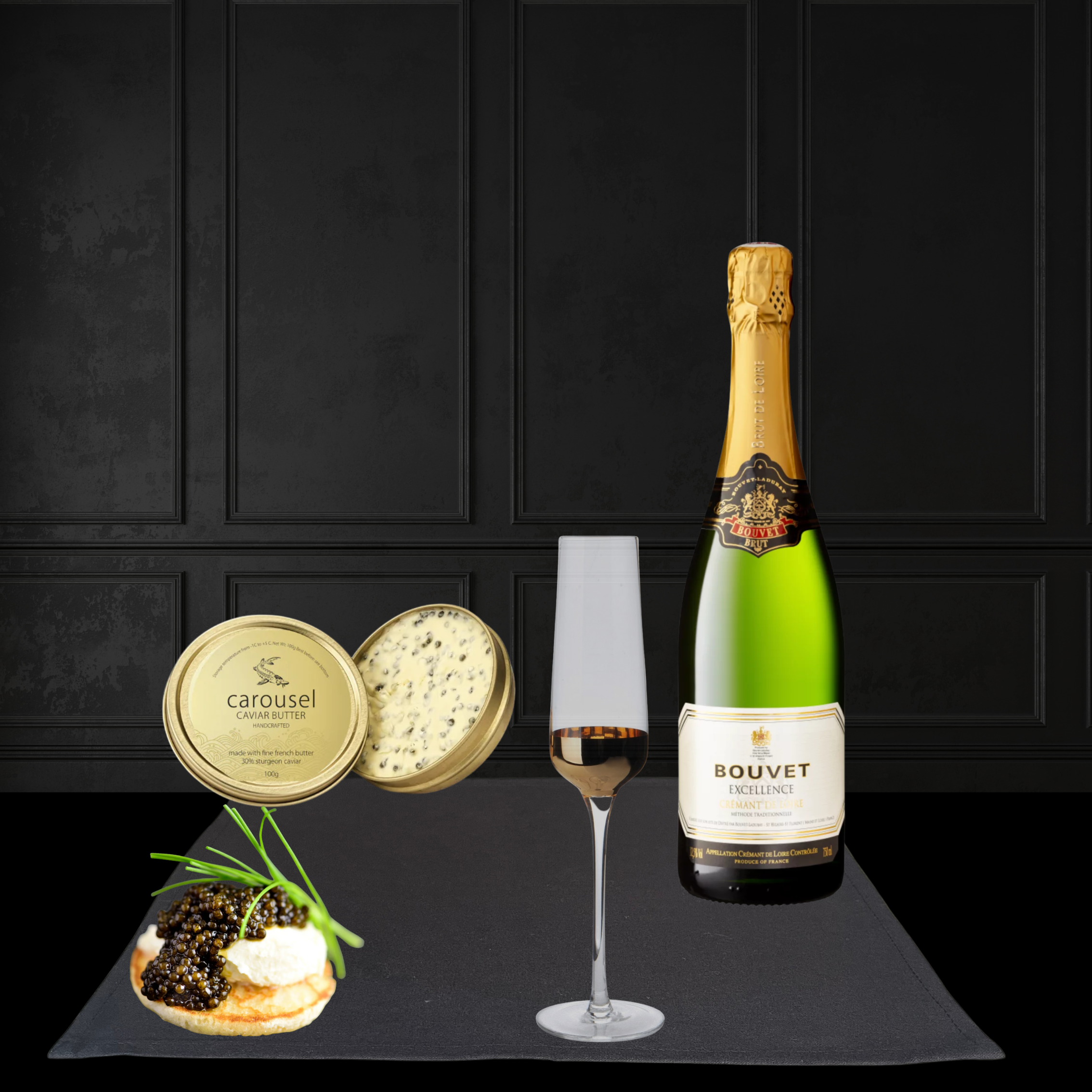 Елегантен френски аперитивен комплект с пенливо вино Bouvet Crémant, изключителен руски есетра хайвер на Carousel Caviar, копринено масло с есетра на Carousel Caviar, мини блини, шоколад Lindt с портокал – изискано гурме преживяване за ценители.